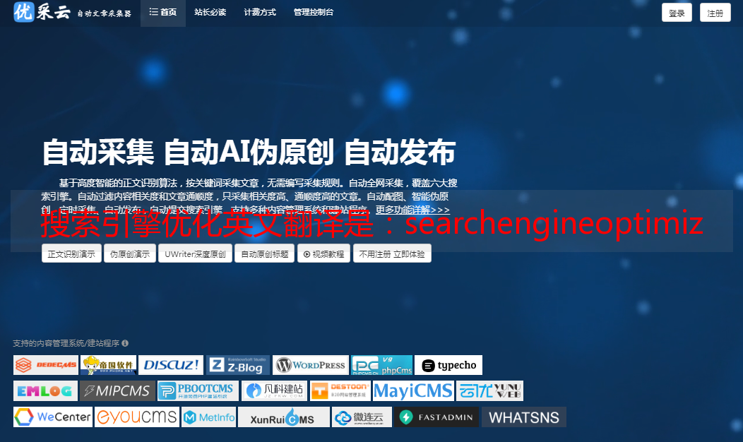 搜索引擎优化是英文缩写:seo;搜索引擎优化是网络营销中的一种技术手段。是以站点为单位进行网络推广的方法,它是个技术活,一般要做三步:1.信息布局。2.网站seo。3.站内优化。